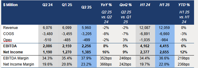 Q2 2025 saw a strong performance across ADNOC Gas’ product portfolio, especially in the local gas market. The Company serves local customers under long-term contracts with competitive prices and improved underlying margins. ADNOC Gas also capitalized on opportunities to sell additional volumes at favourable prices, in the local gas market and in the export market as Liquified Natural Gas (LNG). The Q2 results show that the Company’s product portfolio is resilient to oil price volatility.