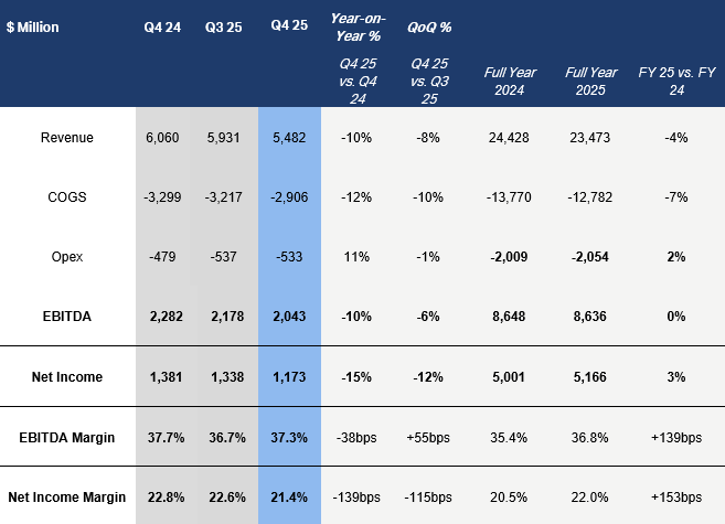 Q4 2025 net income was $1.2 billion despite softer export market pricing. ADNOC Gas increased sales volumes by 5% compared to Q4 2024, primarily driven by strong domestic gas performance, with demand remaining steady throughout the UAE’s milder weather conditions in the final quarter of 2025. Overall, domestic Adjusted EBITDA for Q4 2025 rose 6% year-on-year . This sustained demand is attributable to the robust industrial sector, which contributed to a 4.8% UAE GDP3 growth rate in 2025.
